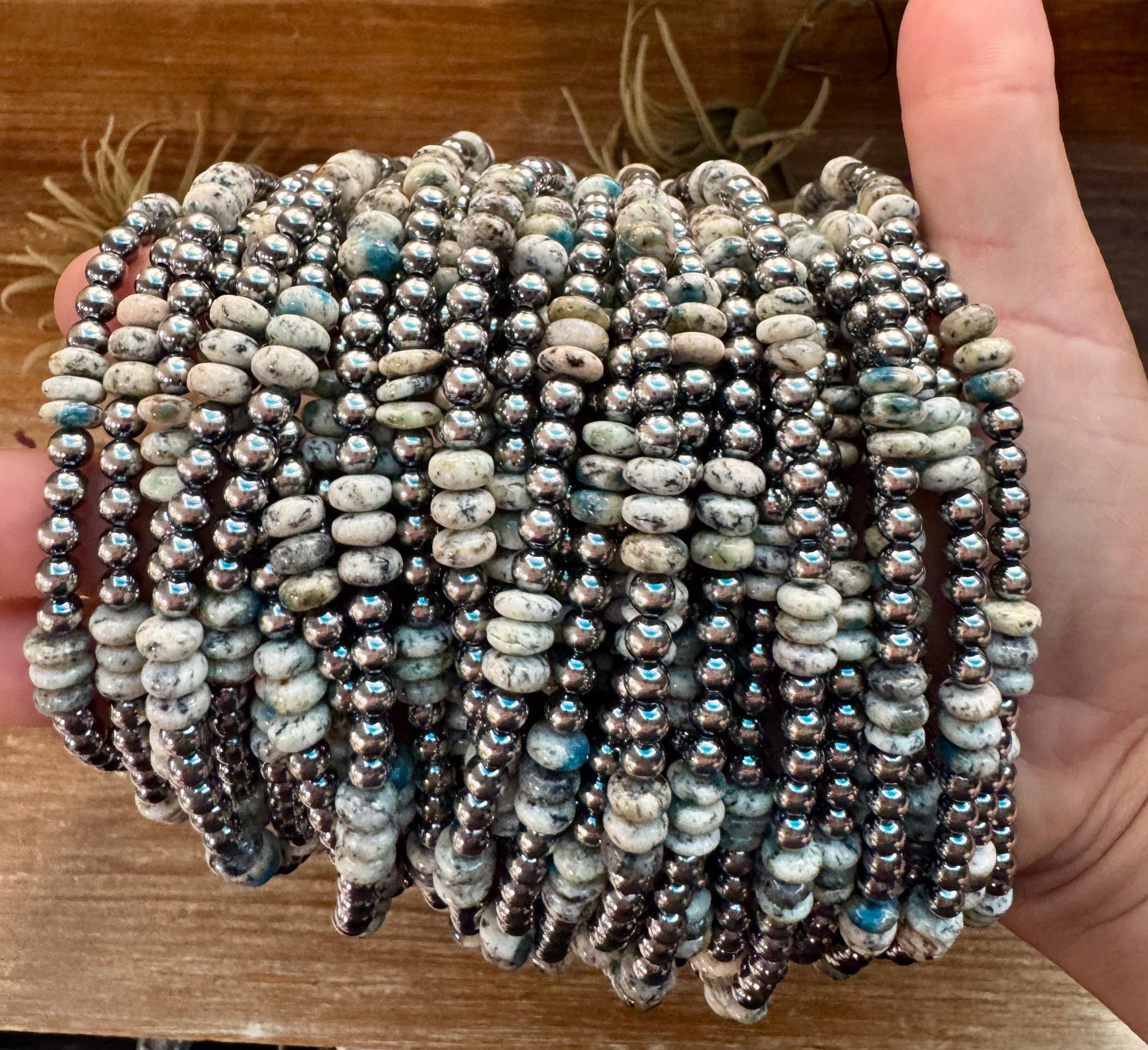 This 19-inch necklace features 5mm sterling silver pearls with 7–8mm natural K2 Azurite rondelles, finished with a sterling silver clasp, findings, and a 2-inch extender for added versatility. A rare statement piece with meaning, balance, and beauty.
