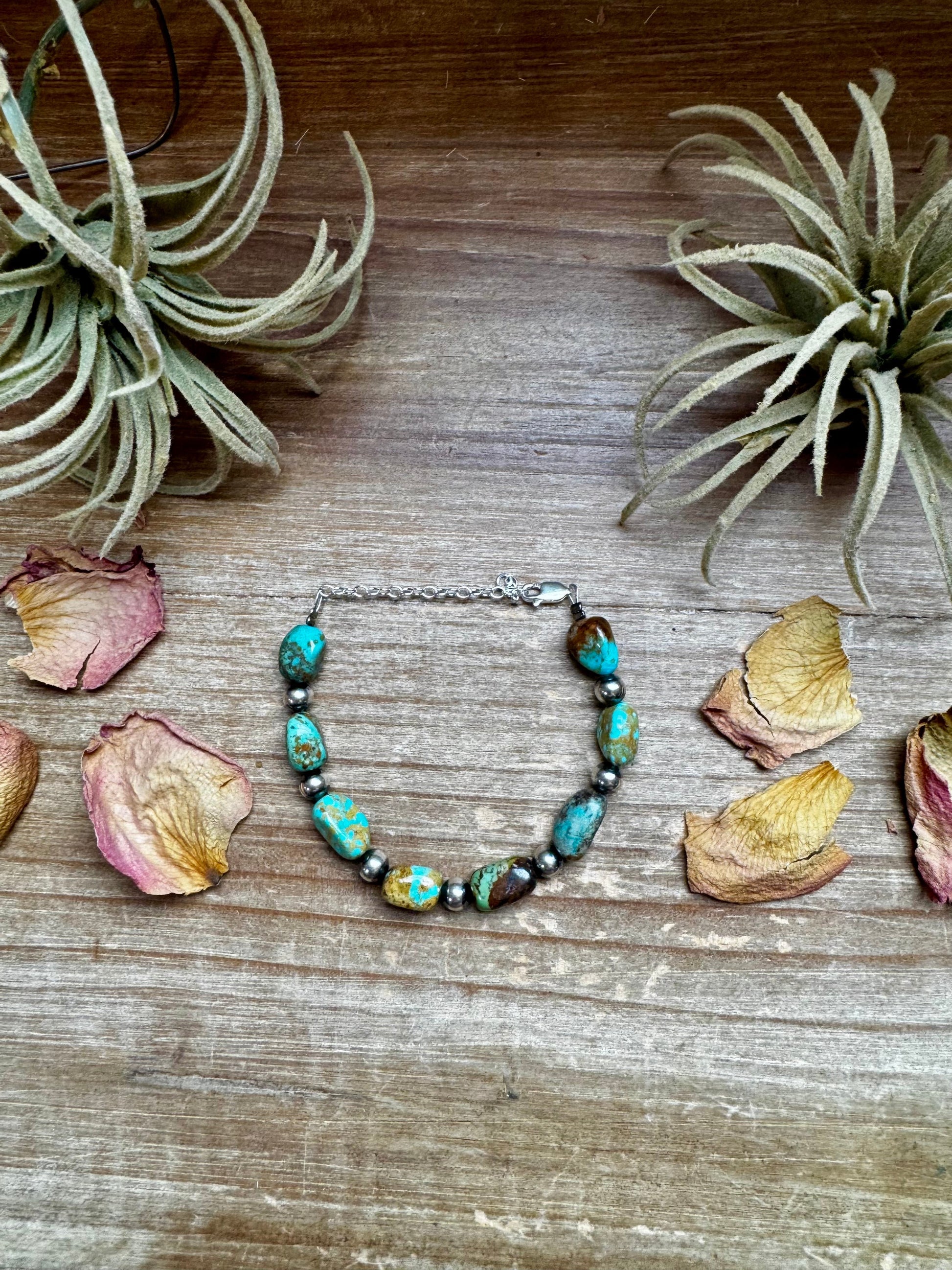 Measuring 6.5 inches from the lobster clasp to the end of the beaded wire, plus a 2-inch sterling extender chain, this piece fits comfortably and layers beautifully with your other favorites. Every turquoise nugget is hand-selected, so no two bracelets are ever the same.
